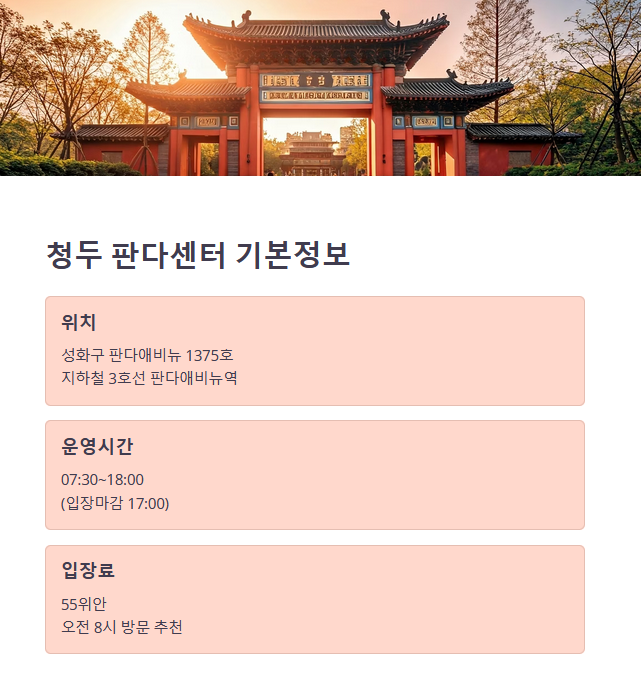 - 추천 루트: 정문 → 아기 판다 하우스 → 청소년 구역 → 홍판다 → 전시관